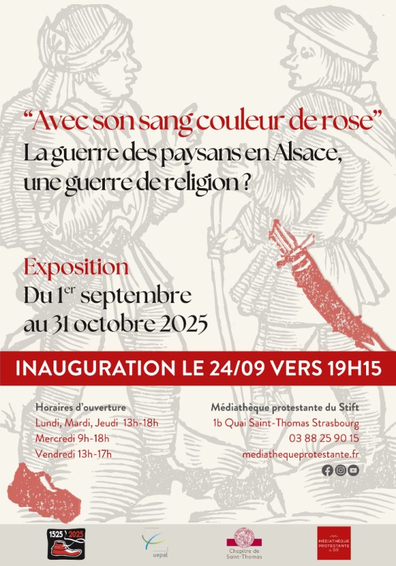 En Alsace, 2025 marque le 500e anniversaire de la guerre des Paysans, cette révolution qui touche le Saint-Empire entre 1524 et 1525. Les insurgés affirment leur identité chrétienne et revendiquent de nouveaux droits. Quant aux autorités, notamment lorraines, elles répriment le mouvement au nom de la foi traditionnelle. Indéniable, la dimension religieuse de cet épisode est au cœur de l'exposition de la Médiathèque. Après une évocation des bouleversements spirituels qui précèdent 1525, l’exposition met en lumière la place du christianisme dans les revendications des Paysans ainsi que l’influence des premiers textes réformateurs sur ces revendications. Elle présente ensuite la réaction des réformateurs, au premier rang desquels Luther, face au conflit. Elle analyse enfin le rôle des autorités politiques et ecclésiastiques dans le conflit, de la ville de Strasbourg au duc de Lorraine en passant par le Chapitre de Saint-Thomas.