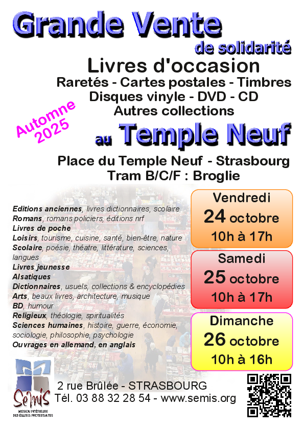 Grande vente de solidarité au Temple Neuf: 24, 25 et 26 octobre 2025 7 octobre 2025 Livres d'occasion, raretés, cartes postales, timbres, disques vinyle, DVD, CD, autres collections... Place du Temple Neuf – Strasbourg Tram B/C/F: Broglie Consulter la liste des actualités